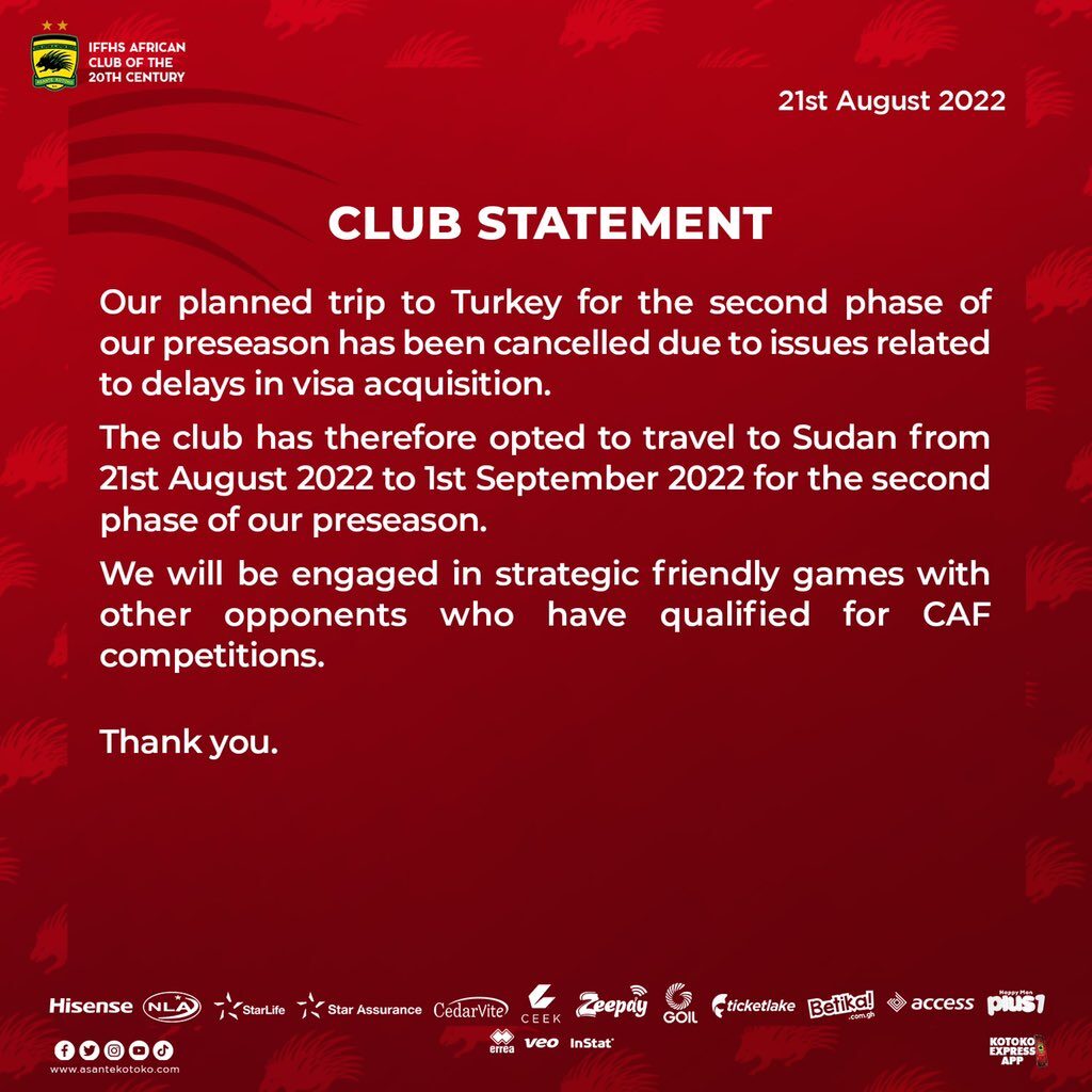 The club has issue a statement this morning to explain the reason for the cancelation of the trip to visa issues and have therefore decided to travel to Sudan.