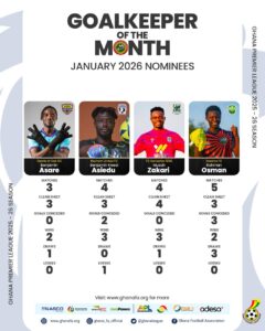 The Ex-National Goalkeepers Union has shortlisted four outstanding shot-stoppers for the Premier League Goalkeeper of the Month Award for January, following a series of commanding performances for their respective clubs. The nominees are Benjamin Asare (Hearts of Oak SC), Benjamin Kwesi Asiedu (Bechem United), Musah Zakari (FC Samartex 1996) and Rahman Osman (Dreams FC).