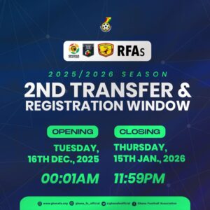 The Football Association has announced that the second registration window for the 2025/26 season will open at 00:01am on Tuesday, December 16, 2025, and close at 11:59 p.m. GMT on Thursday, January 15, 2026.