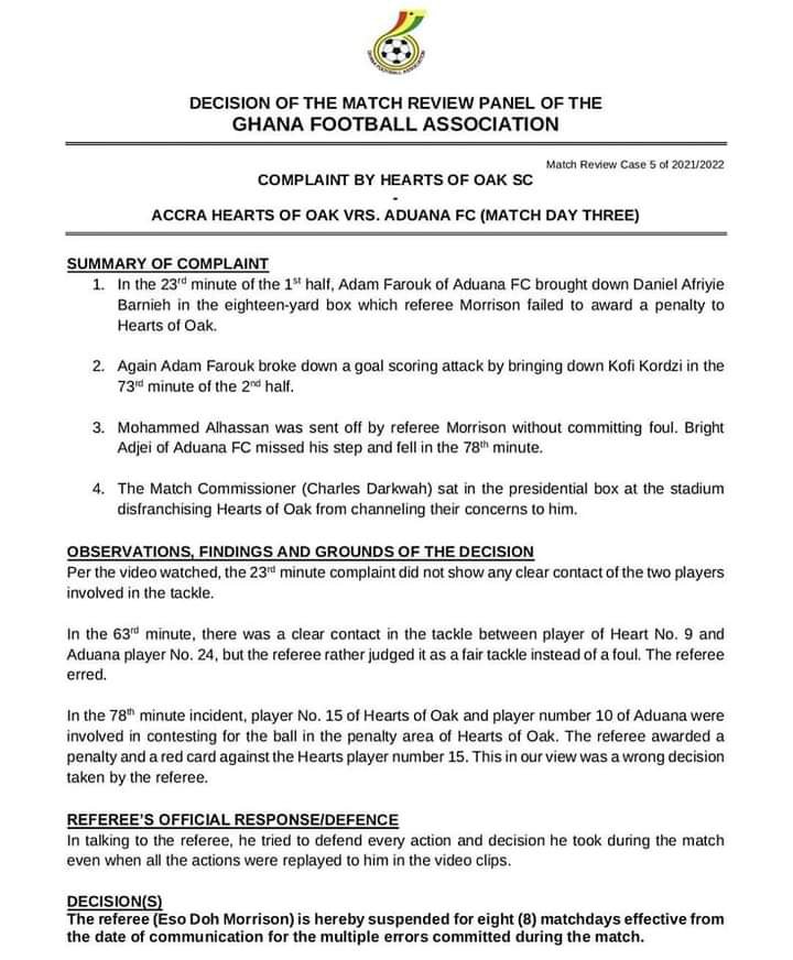 Referees Eso Doh Morrison, has been handed suspensions by the Review panel for errors made in Hearts and Aduana game at Accra Sports Stadium.