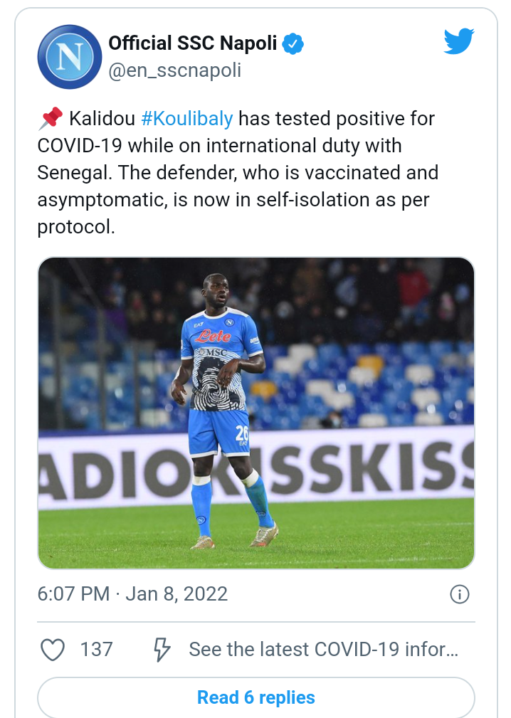 “Kalidou Koulibaly has tested positive for Covid-19 while on international duty with Senegal. The defender, who is vaccinated and asymptomatic, is now in self-isolation as per protocol,” a Napoli statement said.