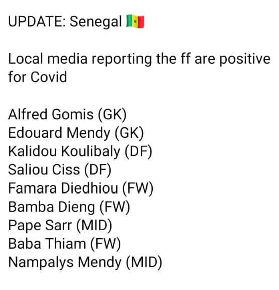The Senegal Football Federation general secretary Victor Seh Cisse later said that a further six staff members had also tested positive.